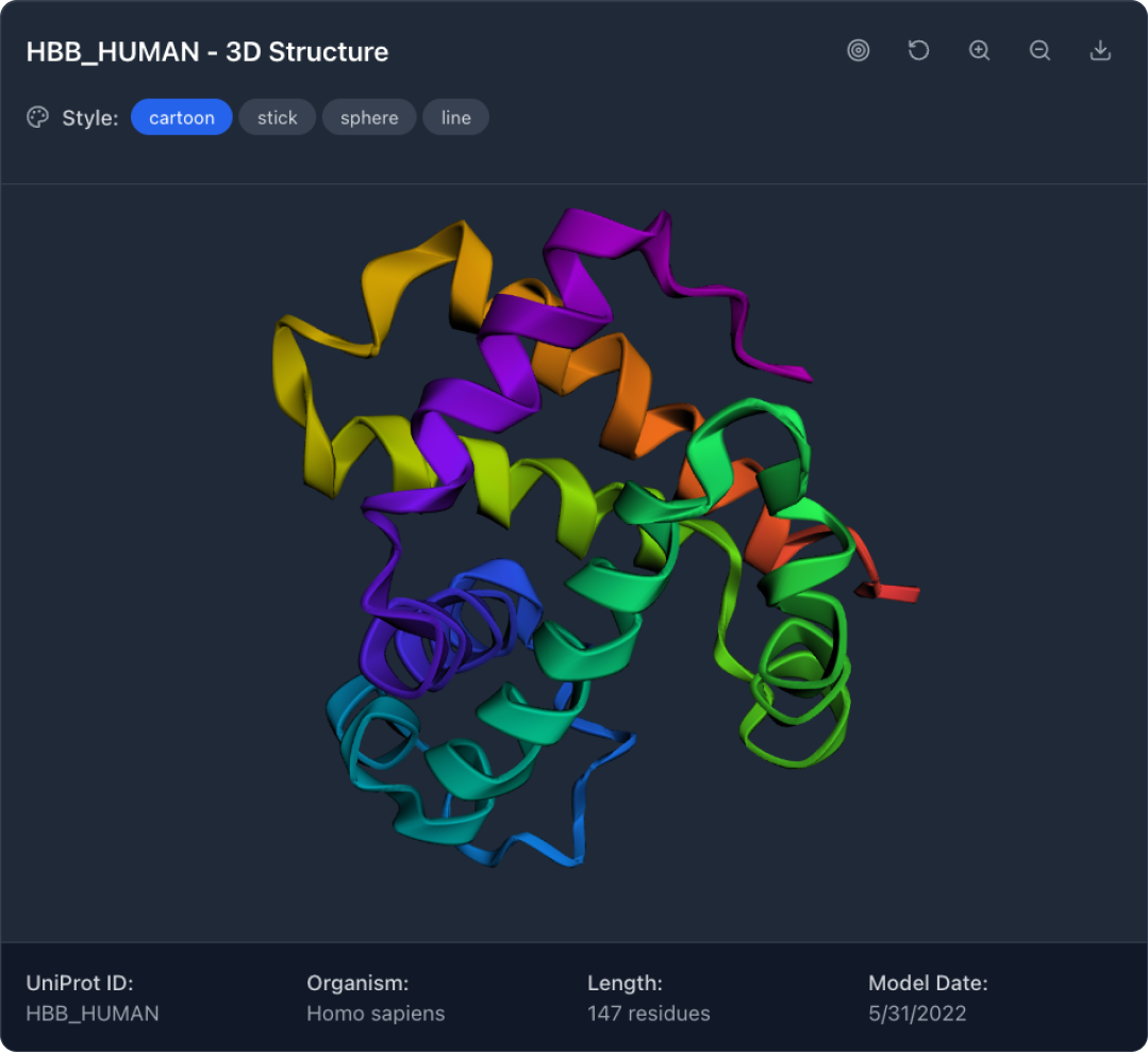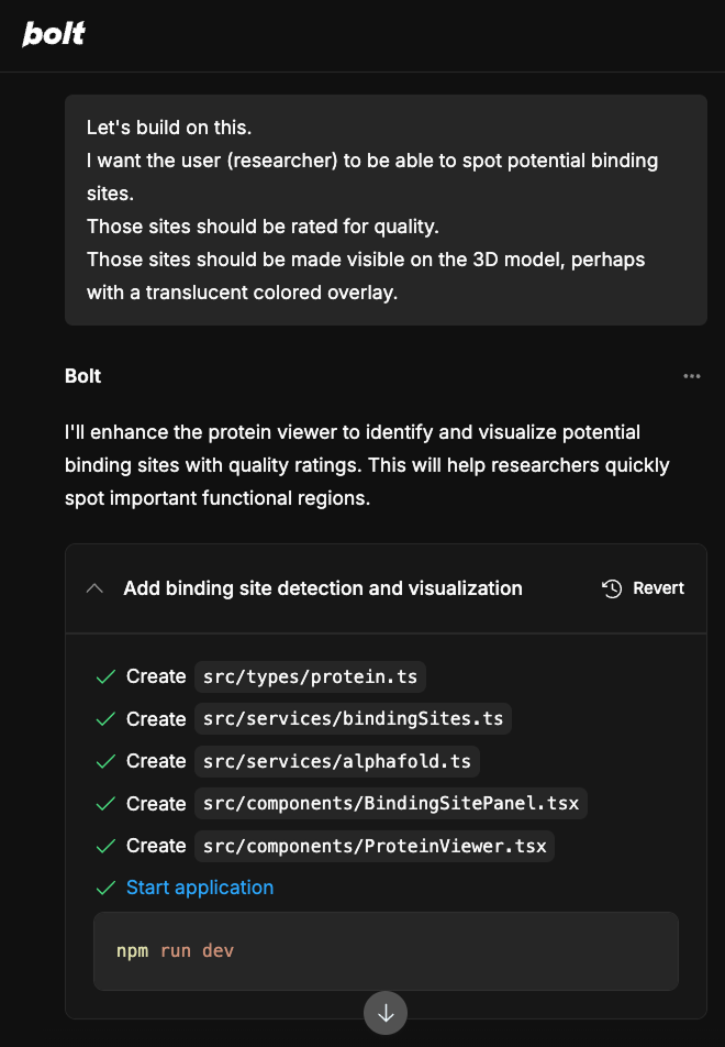 My initial prompt was for Bolt to create a protein folding viewer by tapping into AlphaFold and to render the UI in dark mode.